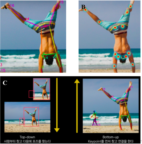 여러 사람에 대해 진행한다면 영상에서 사람을 detect 한 후, 좌표를 찾는 Top-down 방식과 관절 key-points를 추정하고, 이에 대한 상관관계 분석으로써 pose를 얻는 bottom-up 방식으로 나뉜다(그림 04.C).