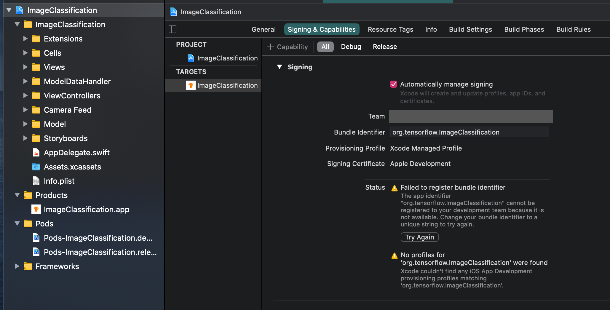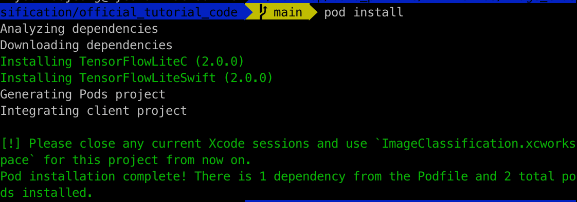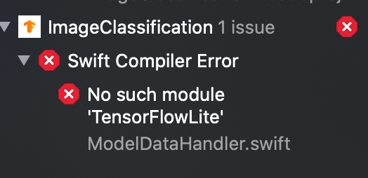 - ImageClassification.xcworkspace 가 아닌 ImageClassification.xcodeproj 로 프로젝트를 연 것이 아닌지 확인해보자.