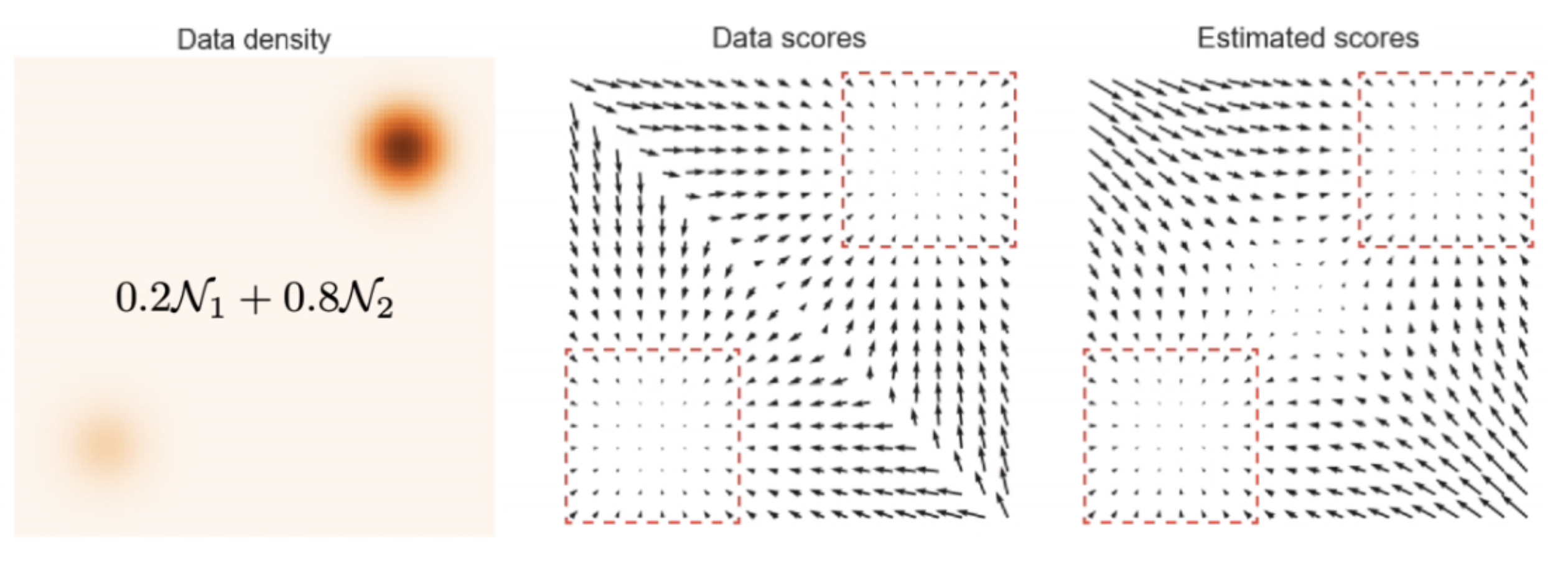 다음과 같이 2개의 정규분포의 가중치를 다르게 했을 때 Data Score 이지만, Sliced Score Matching을 이용해 학습해 예측한 score는 다르게 나옵니다. 이것은 실제로 수렴하는 것에 대한 이슈이며, sampling을 했을 때 정상적으로 sampling되는지 의문을 던지게 됩니다.