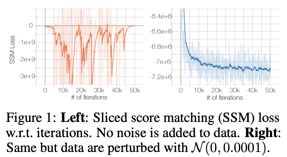 두번째로는, data distribution의 support가 whole space일 경우에만 정상적으로 score estimator로써 작동할 수 있다고 합니다. 그렇기 때문에, 저자들은 간단한 실험을 제안합니다. Unperturbated data와 perturbated data를 이용해 Sliced Score Matching을 진행했을 때, 노이즈를 추가하지 않은 unperturbated data의 loss는 Figure 1과 같이 불규칙하게 나오지만, perturbated data의 loss는 일정하게 수렴하는 것으로 나오게 됩니다. 그리고 이것은 Gaussian noise의 distribution이 support가 $R^D$로 정의되기 때문이라고 이야기 하고 있습니다.