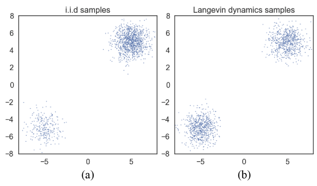 또한, Langevin Dynamic에 대해서도 문제점을 제시합니다. Langevin Dynamic을 이용해 Sampling을 했을 때, low density를 충분히 반영하지 못한다는 문제점이 있습니다. $p_{data}(x)=\pi p_{1}(x) + (1-\pi)p_{2}(x)$ 라고 정의했을 때, $p_{data}$의 score는 $\pi$에 영향을 끼치지 않기 때문에 sampling을 할 때 low density를 반영하지 못합니다. 이론적으로는 수렴하게 하기 위해선 굉장히 작은 step size ($\epsilon$)와 굉장히 큰 수의 step을 사용해야 한다고 합니다.