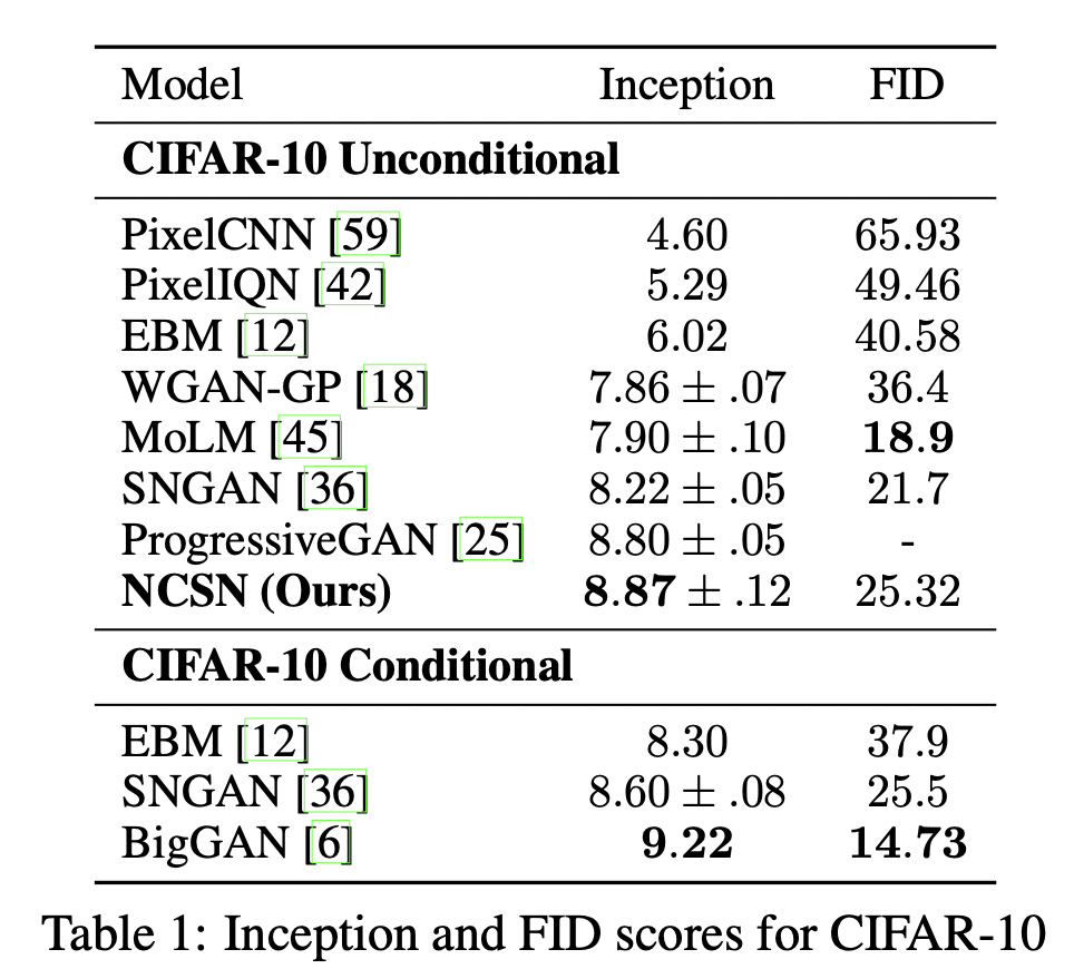 GAN과 비교될 만큼 퀄리티가 좋게 나오지만, 아직은 FID Score를 비교했을 때는 살짝 떨어지긴 합니다. 하지만 NCSN 즉, Noise를 denoising하면서 만들어내는 결과라고 생각하기엔 화질이 좋게 나오고 GAN 만큼의 가능성을 충분히 보여주지 않았나 라는 생각이 듭니다.