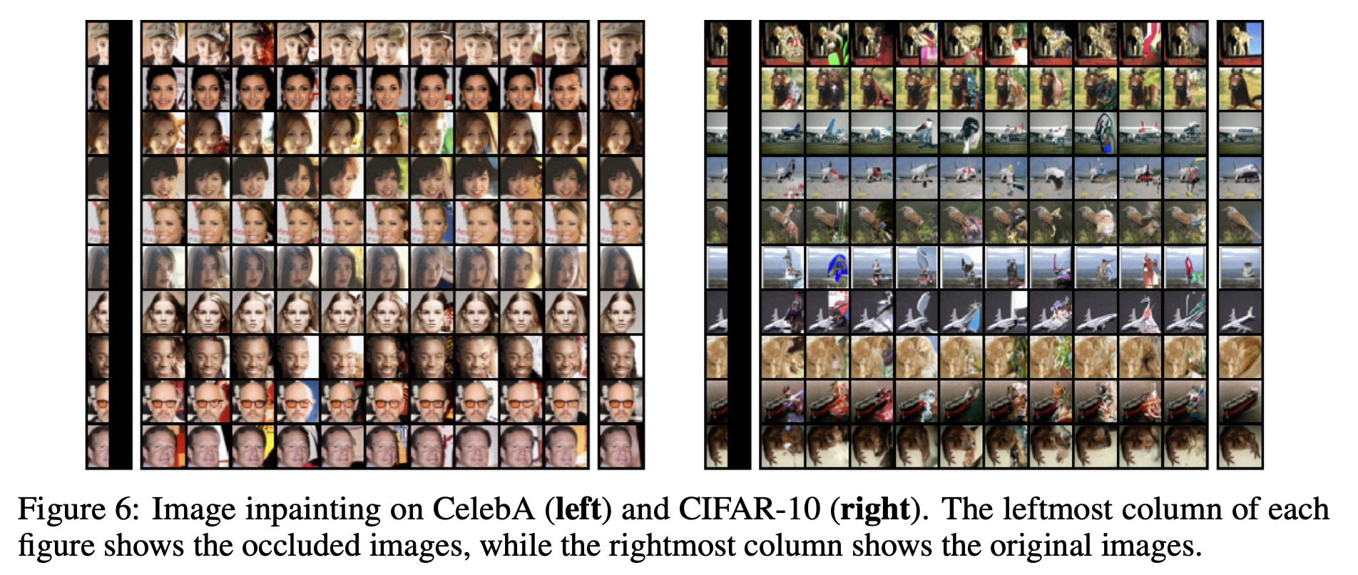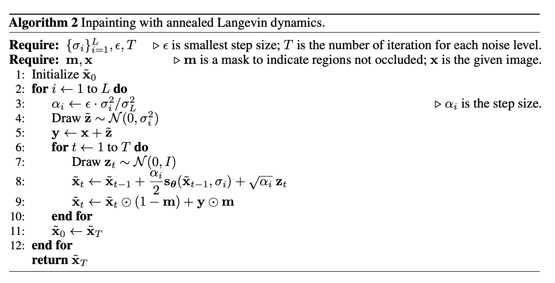 마지막으로, NCSN은 image inpainting이 굉장히 잘 작동합니다. 이는 inpainting하고자 하는 mask를 이용하는 Algorithm 2를 통해 sampling하는 기법을 제안합니다. Algorithm 1에 score network의 input인 perturbated data를 만들 때, 원본의 정보에 perturbing을 시켜 mask를 이용해 원하는 부분만 generation합니다.