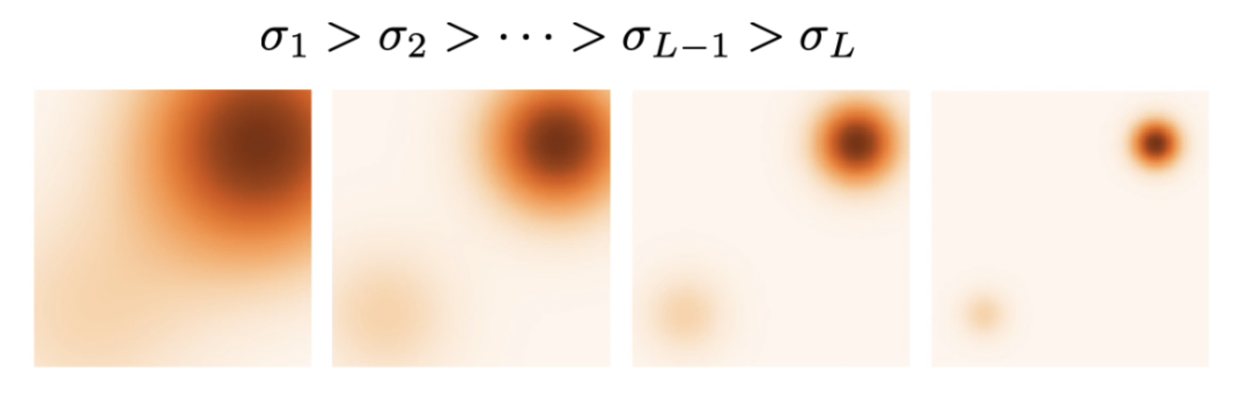 Perturbation schedule을 L step으로 정의하고 gaussian noise를 이용해 만든 perturbation distribution의 score function을 학습합니다. perturbation distribution의 std는 data방향으로 갈수록($\sigma_{L}$) 작아지고 prior방향으로 갈수록 ($\sigma_{1}$) 크게 perturbation schedule을 정의합니다.