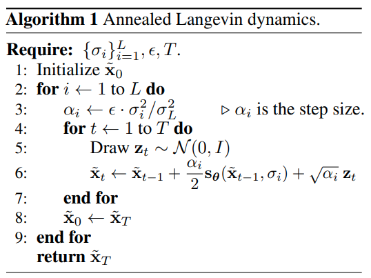 $$ \mathbf{x}_i^{m} = \mathbf{x}_i^{m-1} + \epsilon_{i}\mathbf{s}_{\theta^{*}}(\mathbf{x}_i^{m-1}, \sigma_i)+\sqrt{2 \epsilon_{i} }\mathbf{z}_i^{m}$$