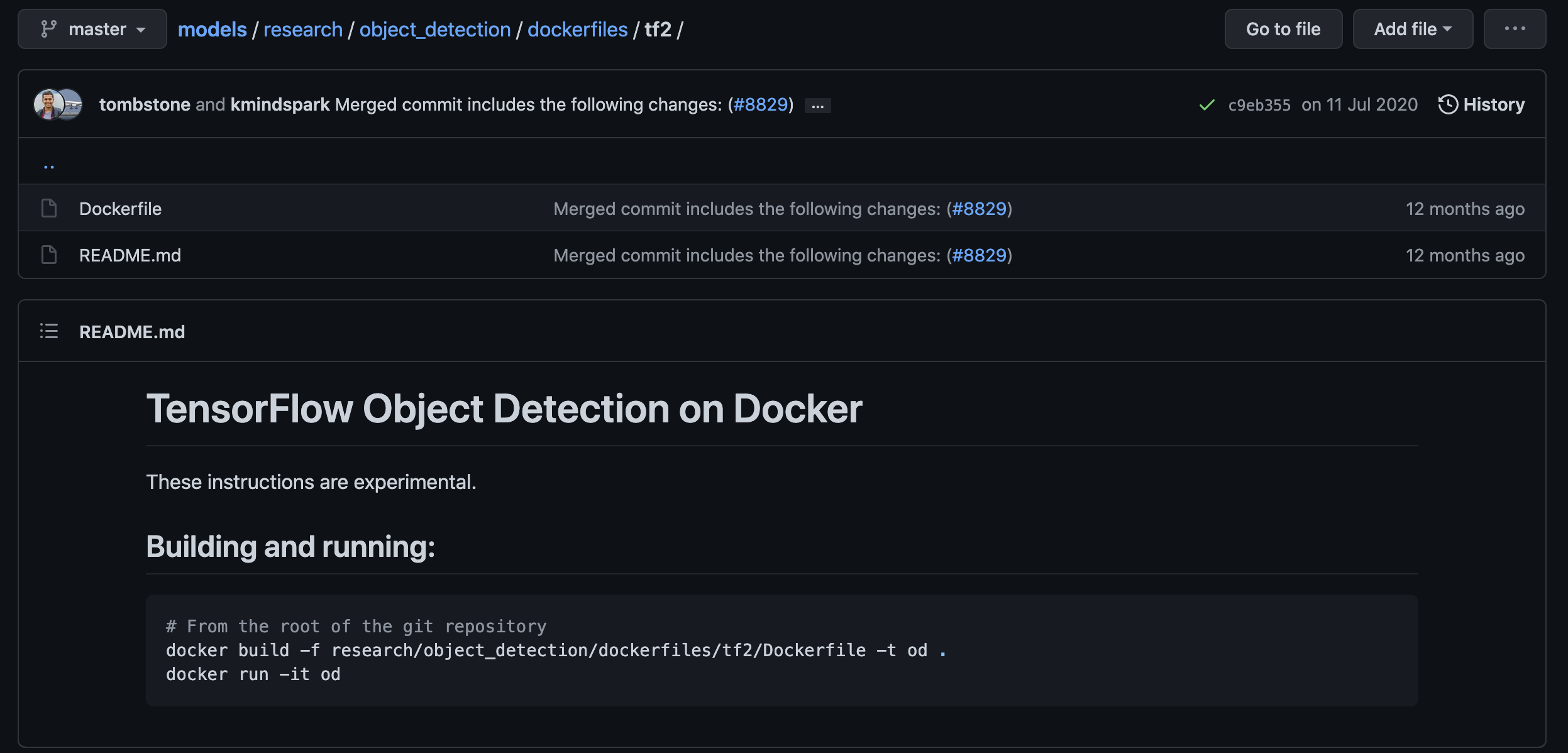 - 아래의 코드는 https://github.com/tensorflow/models/tree/master/research/object_detection/dockerfiles/tf2 의 dockerfile에서 가져온것.