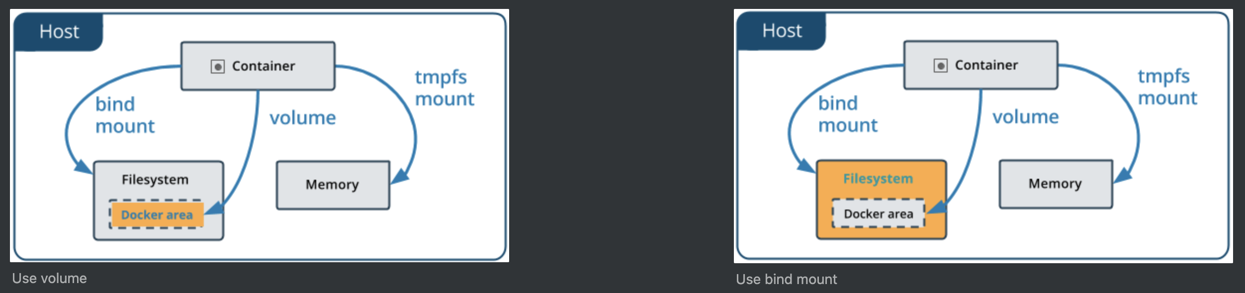 7. Volumes on Docker Desktop이 더 좋은 성능을 낸다. - 밑의 그림 보면 더 잘 이해가 간다. 호스트 파일 시스템 내부에 존재하는 docker area에서 관리되는것이 volume, 그냥 호스트 파일 시스템 어딘가에서 관리되는것이 bind mount이다.