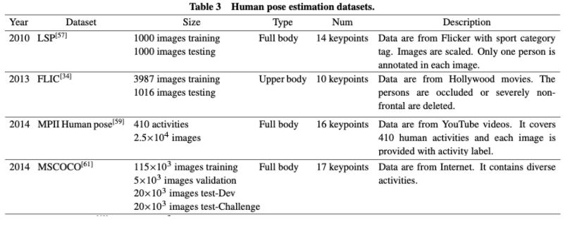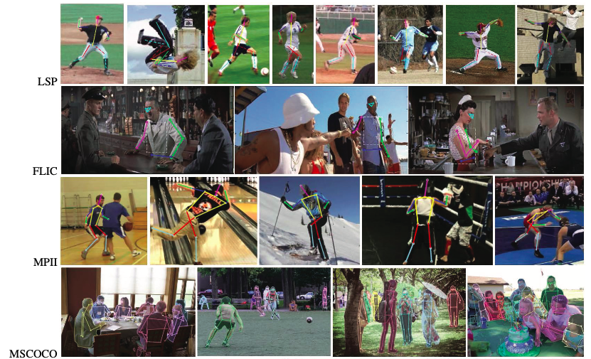 딥러닝을 기반으로 pose estimation을 한다 했을 때, 학습을 위한 dataset들이 필요하다. 모든 dataset을 다 소개 할 수는 없고, 대표적인 dataset 몇개만 선택하여 소개해보려 한다(표 02, 그림05). COCO dataset을 제외하고는 모두 single person에 대한 정보를 제공한다. 소개한 dataset 이외에도 많은 데이터셋들이 있다.
