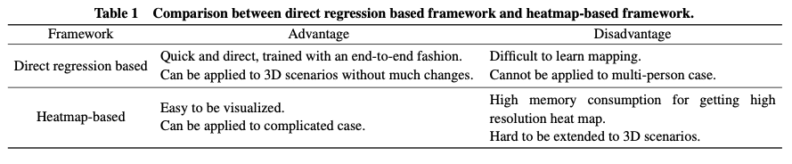 pose estimaion은 크게 2D pose estimation과 3D pose estimation으로 분류 된다. 본문에서는 2D pose estimation에 대해서만 다뤄보려 한다. 2D pose estimation은 그림 03과 같이 분류된다. 영상에서 한명에 대해 pose를 estimation 할 것인가, 모든 사람에 대해 할 것인가(single / multi person). 그림 02. 는 single person human pose estimation의 예시라 할 수 있겠다. 만약 한명에 대해 진행한다면, 바로 관절을 regression을 통하여 구할 것인가(그림 04.A), heatmap (관절에 대한 confidence map) 을 구할것인가(그림 04.B)로 나뉜다 (Direct regression / Heatmap based). 두 방식의 장단점은 표 01과 같다.